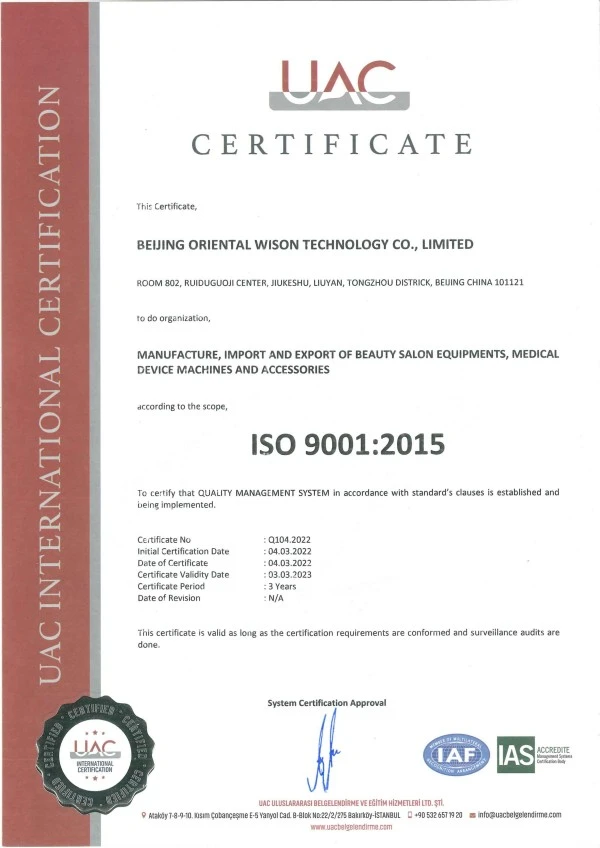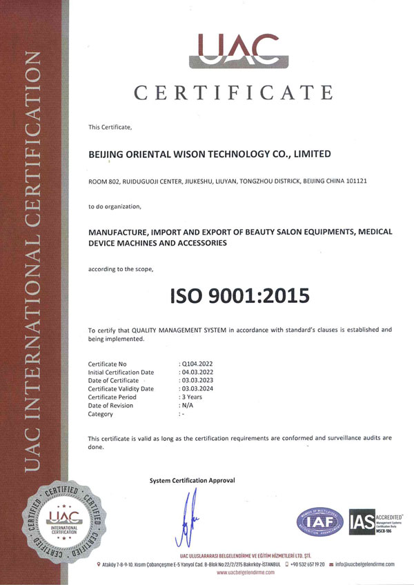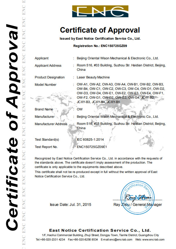 Beijing Oriental Wison Technology Co., LIMITED has been engaged in the beauty equipment fields Since 2002. We have earned a very good reputation worldwide. We integrate on researching, developing, manufacturing,training, selling beauty laser beauty machines. Our product line covers Erbium yag laser, Alexandrite laser, Diode laser, IPL Laser, ND YAG laser, 10600nm Fractional laser, RF micro-needle, EMS machines. We will also provide OEM service powerful distributors from different countries. We have obtained European CE medical certificate, ISO13485: 2008 and ISO9001: 2008 international Quality control system certificate.